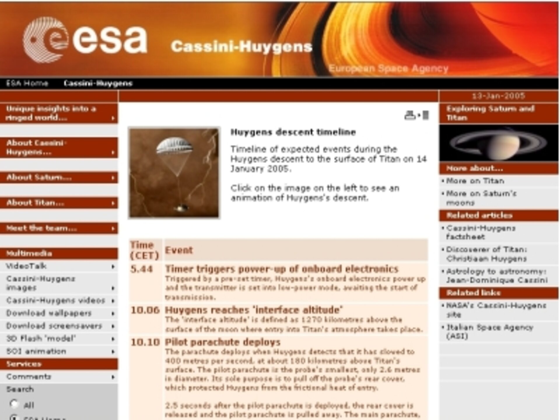A detailed timeline for events expected during Huygens' descent to Titan's surface on Friday, 14 January 2005, has been posted on the Cassini-Huygens' site.