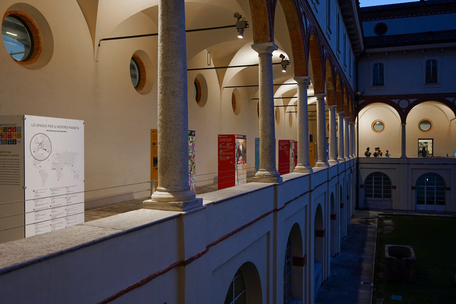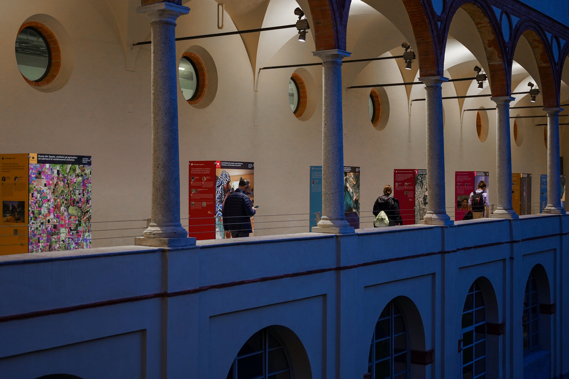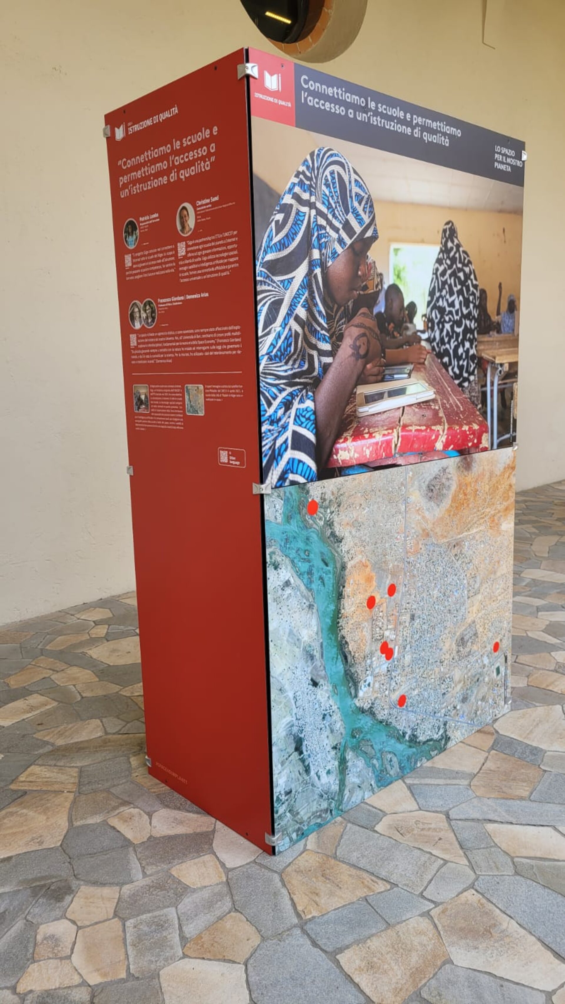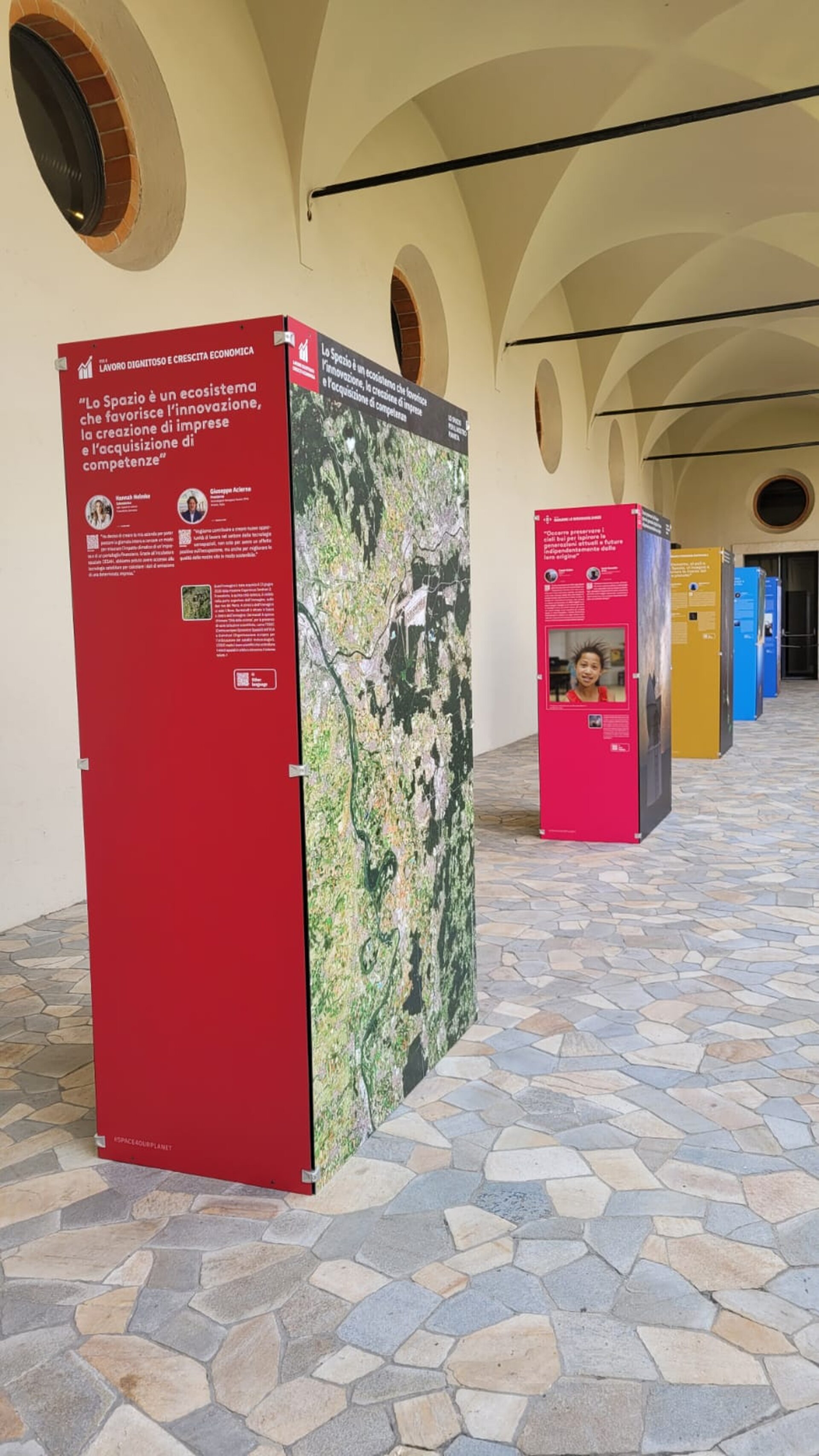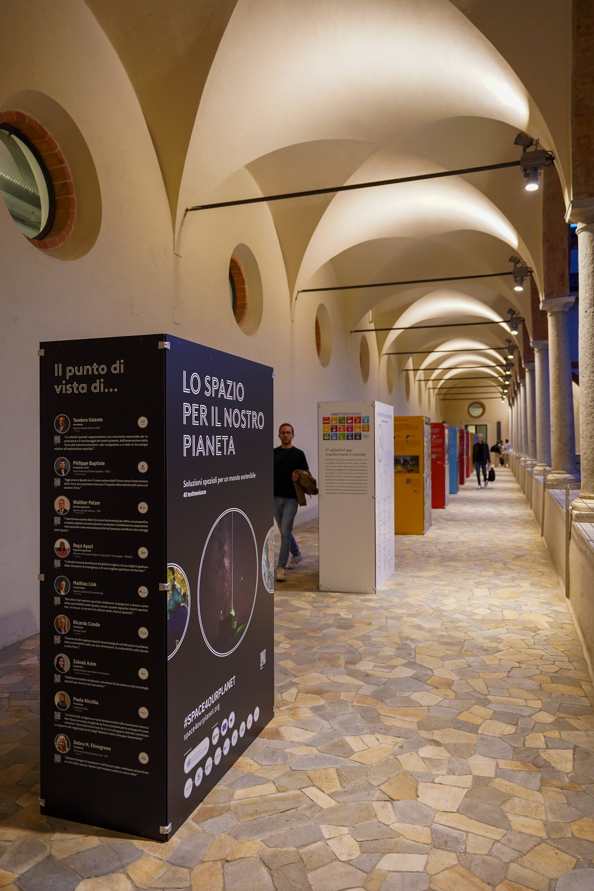 The display includes more than 40 portraits of testimonials from international experts in different in fields, including climate scientists, oceanographers, artists, doctors, astronauts, and many more. Through an immersive combination of audio interviews, images and text, thirty-five 'agents of change' share their experiences of how space is providing a tangible solution to achieve the 17 United Nations' Sustainable Development Goals (SDGs).