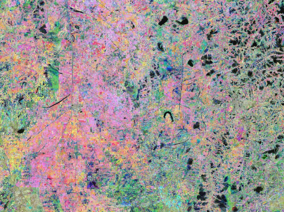 The first image, captured on 15 October 2021, is assigned to the red channel; the second from 24 November 2021, represents green, and the third from 13 January 2022 covers the blue part of the spectrum. All other colours visible in the image are different mixtures of red, green and blue, and vary according to the stage of vegetation growth over the four-month period.
