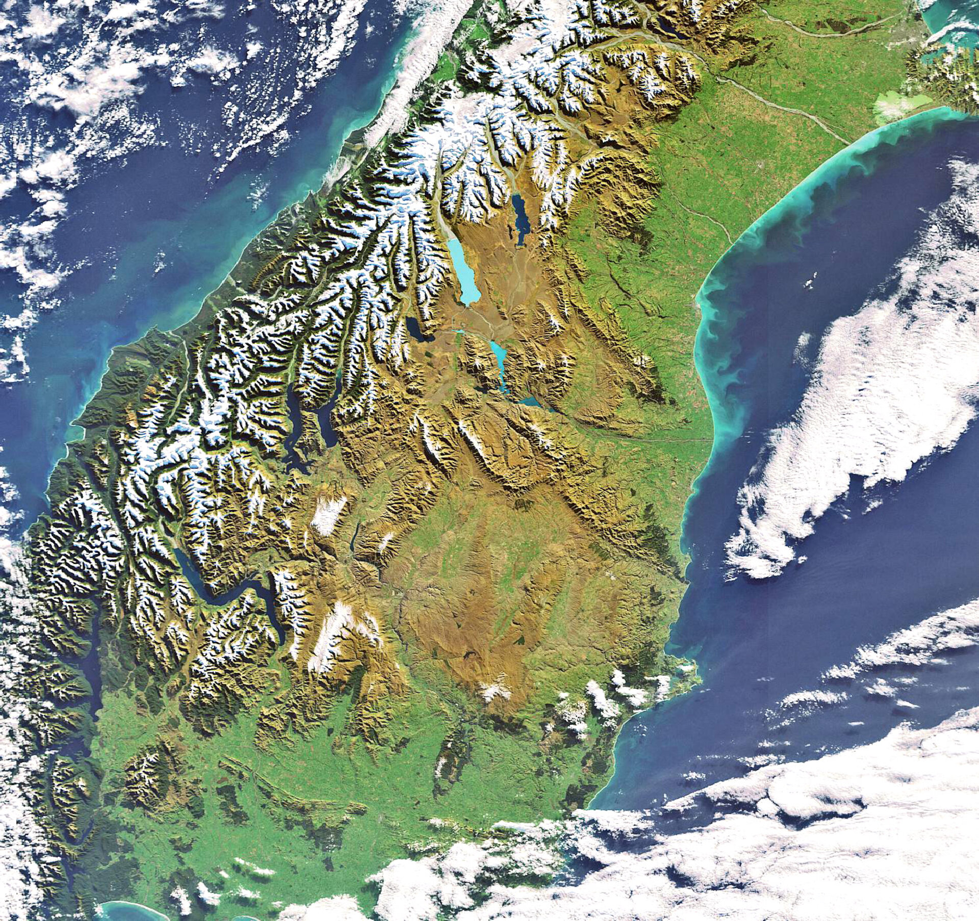 To the east of the Southern Alps are the regions of Canterbury, Otago and Southland. The latter two, visible in the image, are made up of rolling farmland and numerous lakes.