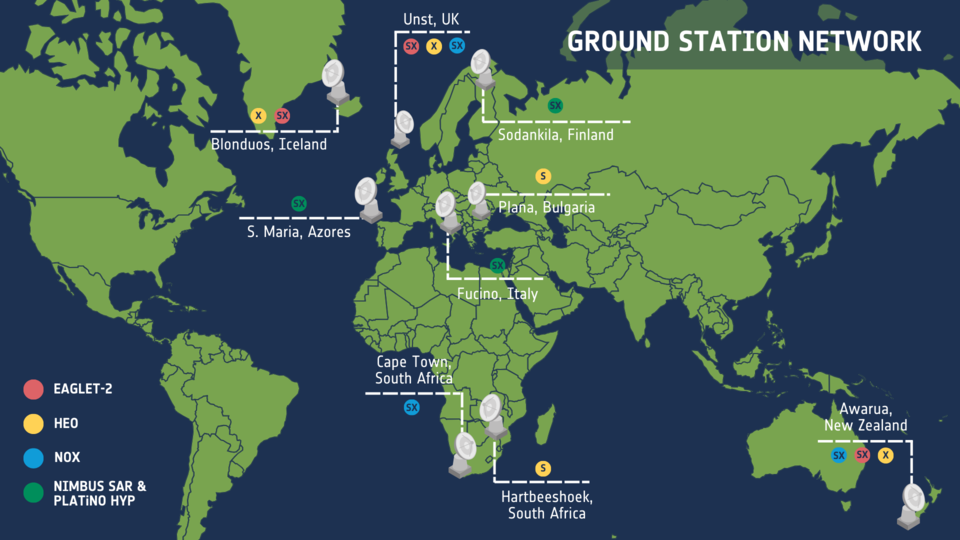 The baseline configuration of the stations used for commanding the satellites and acquiring data is shown below. This station network can be extended if needed.