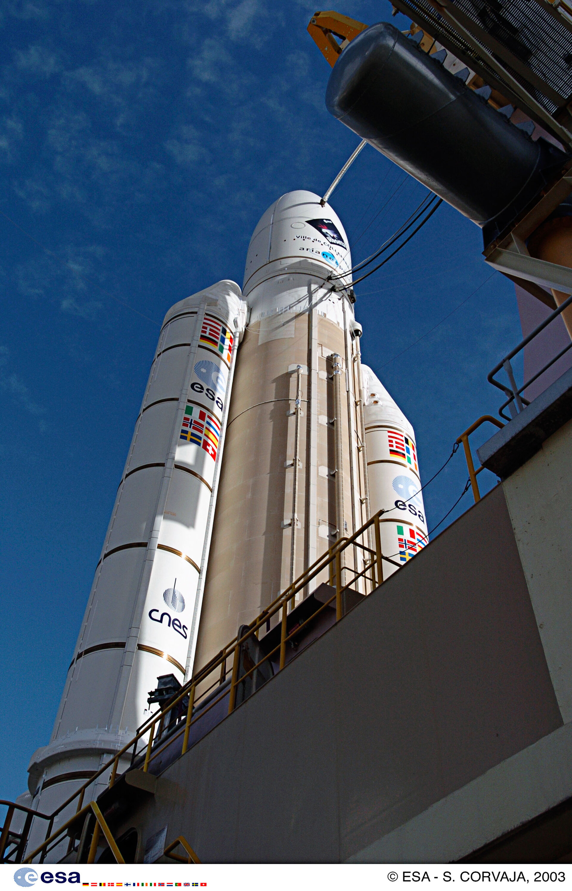 The first Ariane 5G+, atop its mobile launch platform, stands on the pad at the ZL-3. Rosetta, launch campaign.