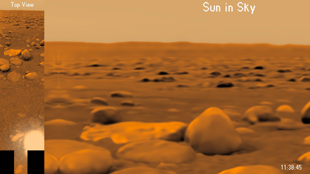 Sounds from a left speaker trace Huygens' motion, with tones changing with rotational speed and the tilt of the parachute. There also are clicks that clock the rotational counter, as well as sounds for the probe's heat shield hitting Titan's atmosphere, parachute deployments, heat shield release, jettison of the DISR cover and touch-down.