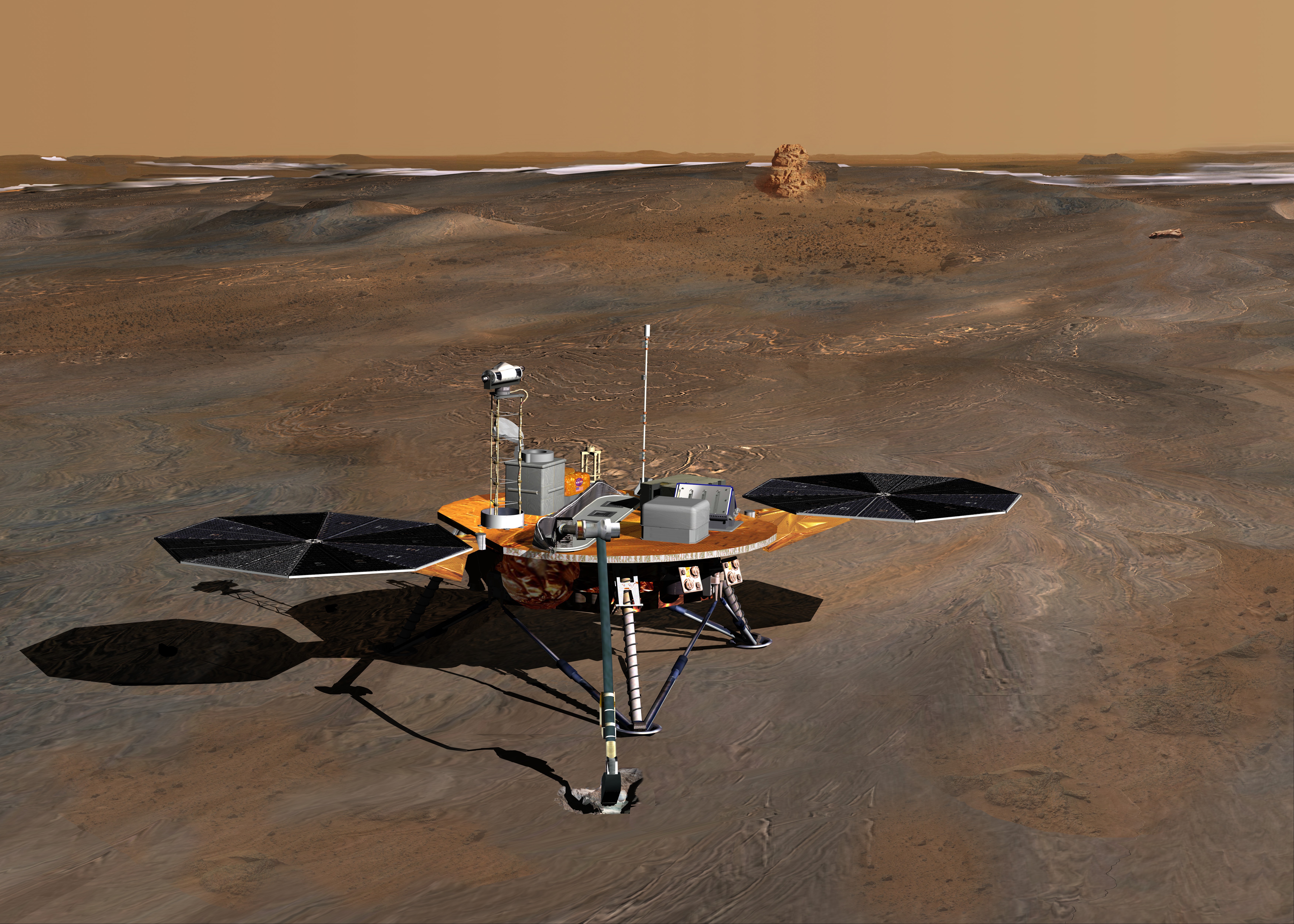 In this artist’s impression of Phoenix on the Martian surface, the lander is shown digging a trench through the upper layer of the soil. The polar water ice cap is shown in the far distance.