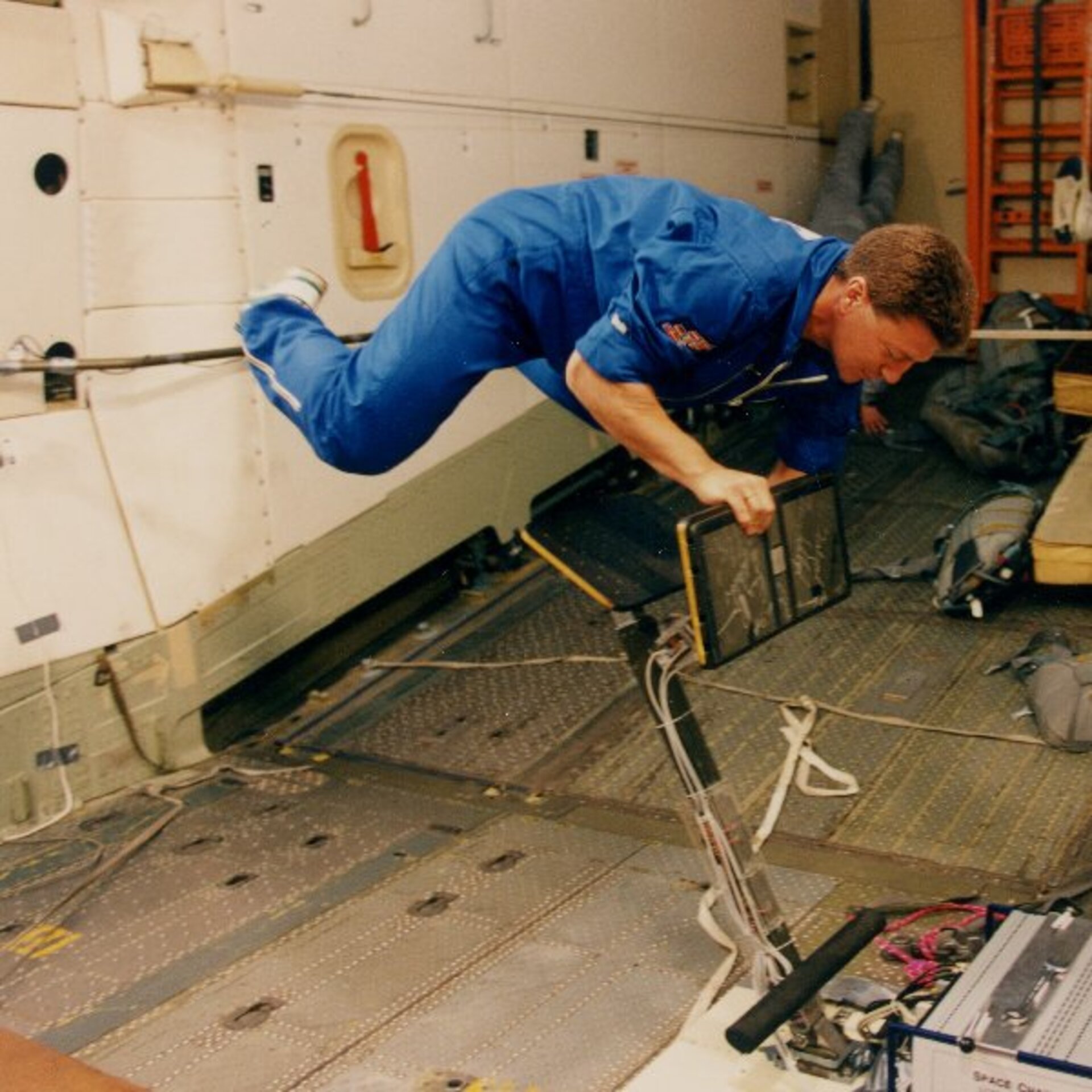 A photo taken during the 19th ESA campaign on board the Ilyushin in July 1994 while Vladimir Pletser was testing the Munich Space Chair.