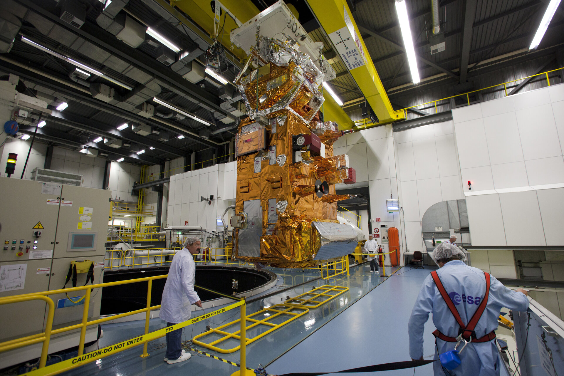 MetOp-B wordt verplaatst van de Large Space Simulator van ESTEC naar de aangrenzende cleanroom. Daar ondergaat de satelliet de laatste voorbereidingen voor het transport naar Friedrichshafen, Duitsland.