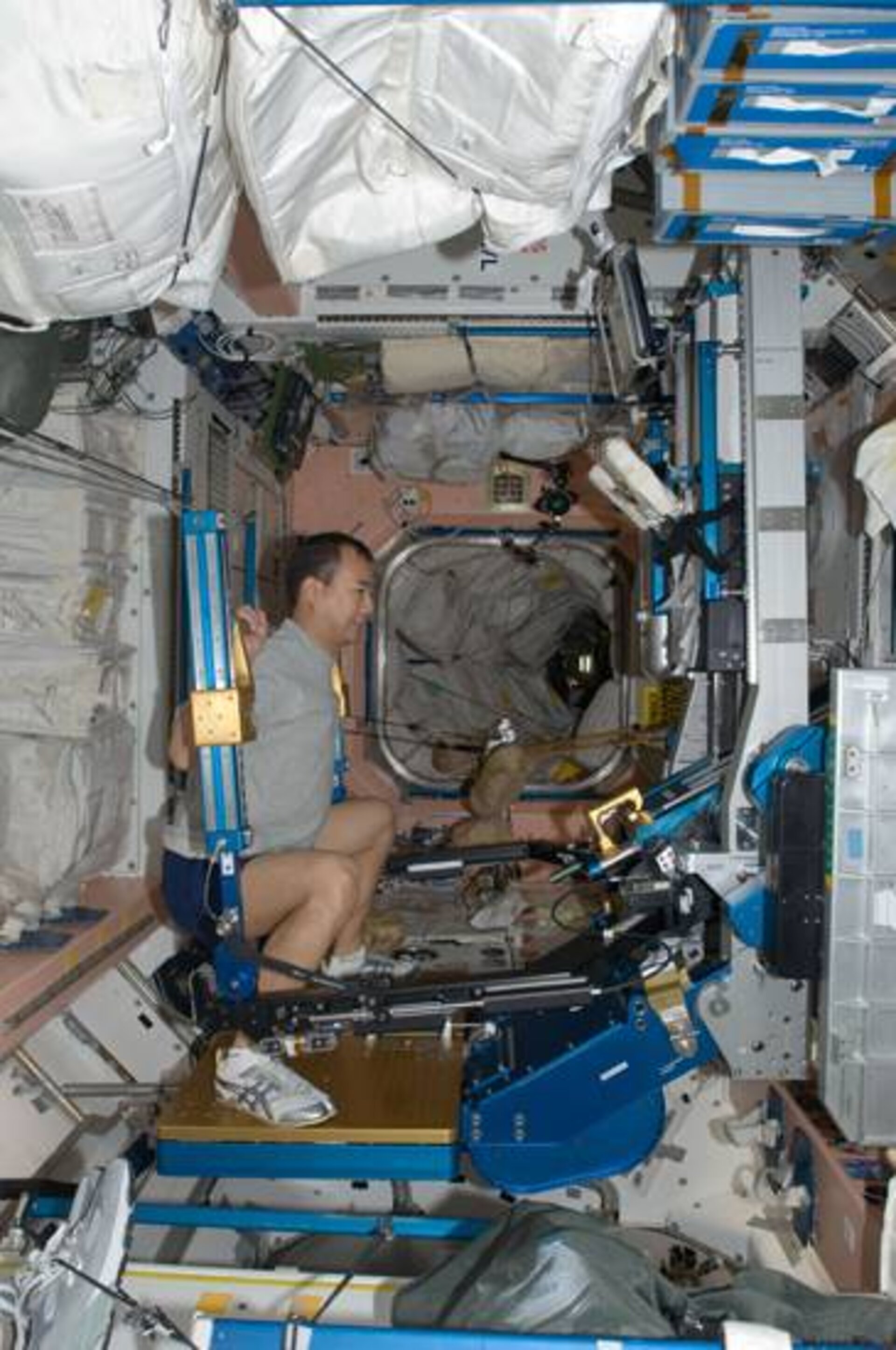 An astronaut performing exercise in the International Space Station.