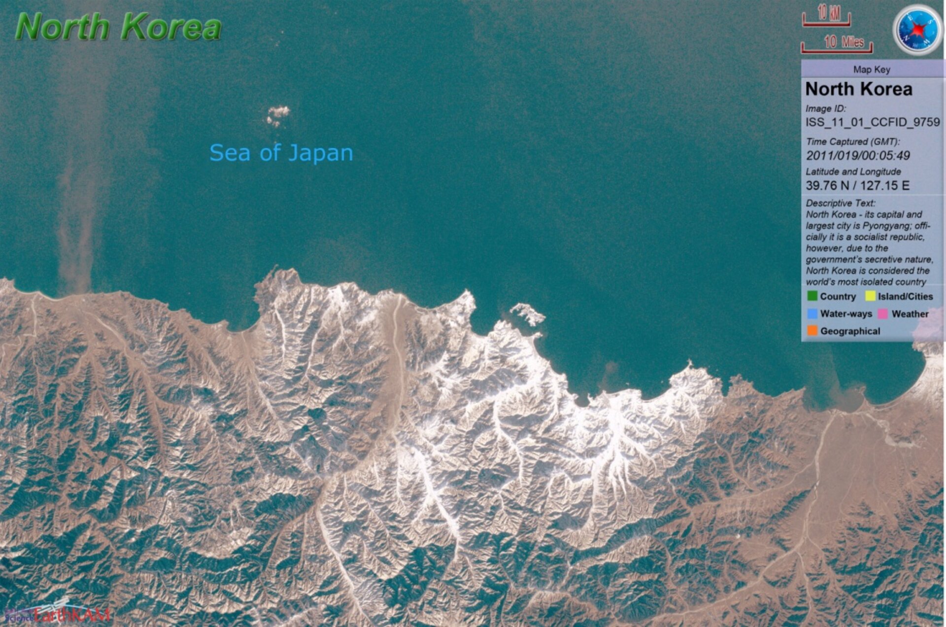 The above photo of North Korea is from a series of images that UCSD students annotate for EarthKAM participants. The photo was taken during the winter 2011 session of EarthKAM.