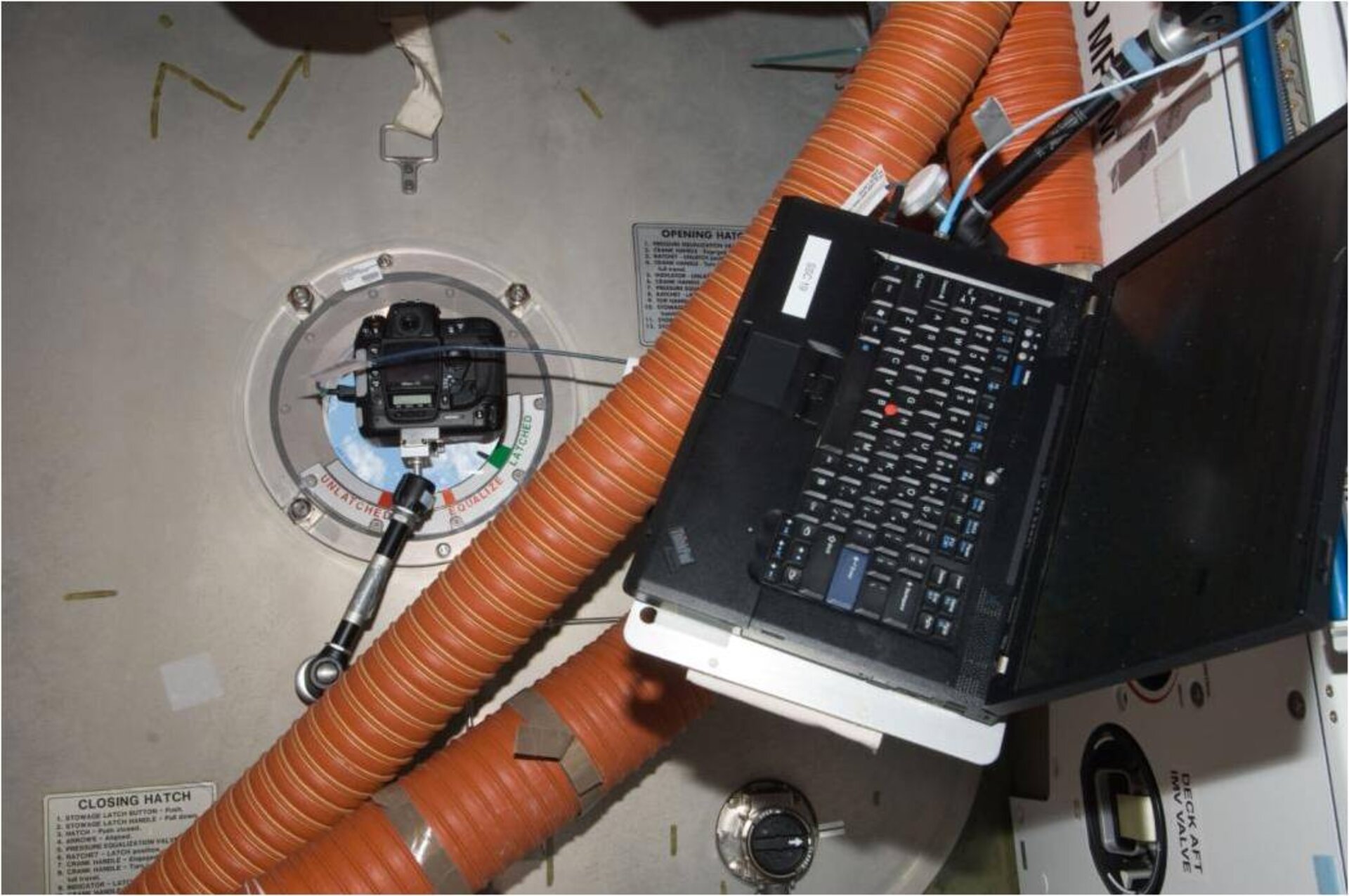 The EarthKAM camera mounted on a multiuse bracket with a clamp at the Node 2 nadir hatch window taken during the EarthKAM session in July 2011.