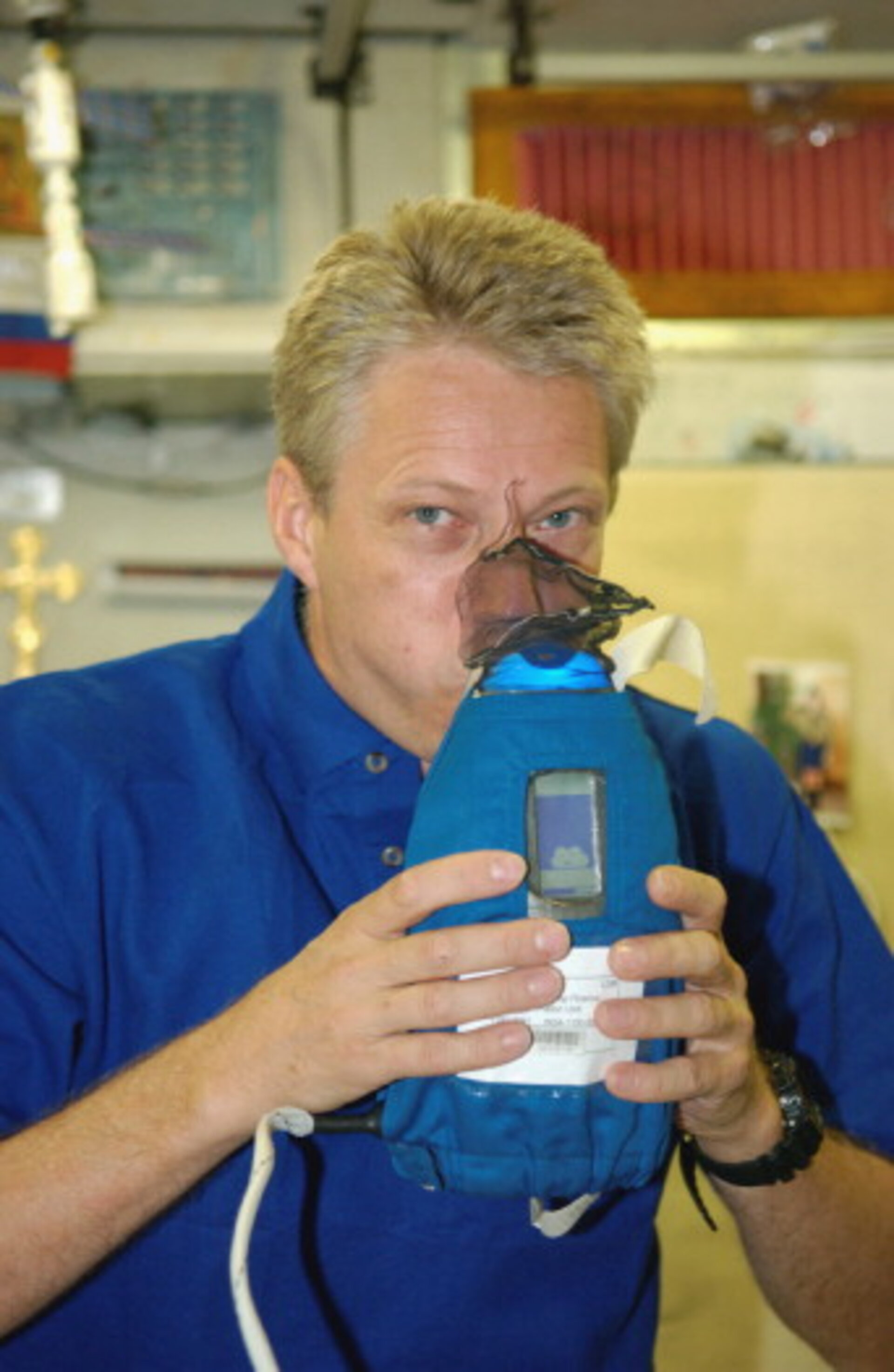 Former ESA astronaut Thomas Reiter undertaking science activities for the Nitric Oxide Analyzer (NOA) experiment in 2006.