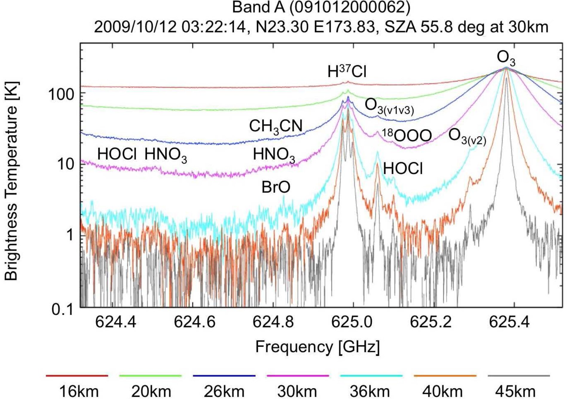 An example of a spectrum observed with SMILES. For comparison of spectra on different tangent heights, the baseline of each spectrum is vertically displaced. Random noise of the spectra is about 0.4–0.6 Kelvin among all tangent heights.