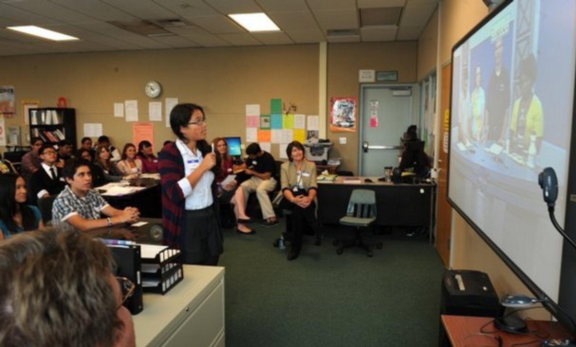 Rita Nobile, 15, of Pacifica High School, speaks to members of NASA’s Digital Learning Network