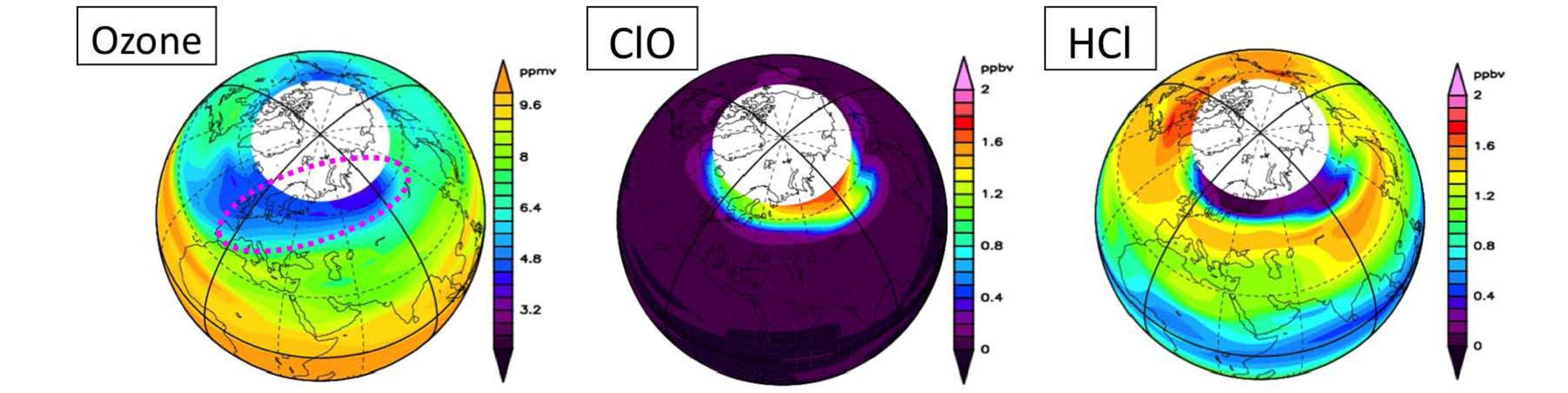 Beispiel für ein von SMILES erfasstes Spektrum. Zu Vergleichszwecken mit Spektren bei anderen Tangentenhöhen sind die Basislinien der einzelnen Spektren vertikal verschoben. Das Rauschen der Spektren liegt bei allen Tangentenhöhen bei etwa 0,4 bis 0,6 Kelvin. (mit freundlicher Genehmigung von Fujitsu FIP)