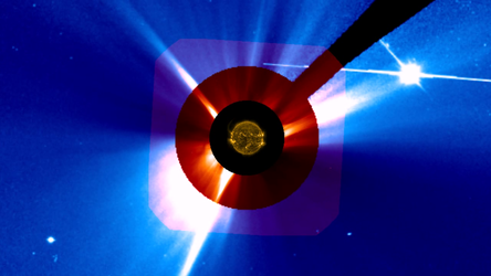 A solar flare seen by the LASCO imager on board the ESA/NASA SOHO spacecraft on 31 August 2012 at 23:30 UTC. The eruption was accompanied by a C8 flare and a full halo coronal mass ejection (CME) causing a minor geomagnetic storm on Earth. The core of the ejected filament was not directed towards Earth, but behind it