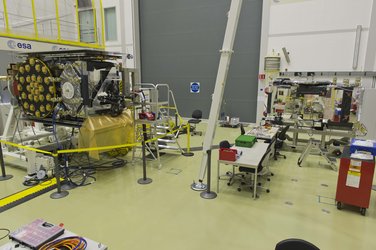 Galileo Full Operational Capability Flight Model 2, FM2, satellite's main L-band antenna used for broadcasting navigation messages, seen during preparation for a mass property test at the ESTEC Test Centre at the end of August 2013.