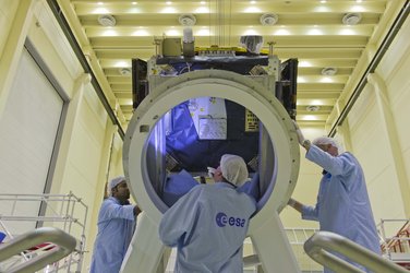 The first two Galileo Full Operational Capability (FOC) satellites seen together at the ESTEC Test Centre on 30 August 2013. The second flight model, FM2, is in the foreground to the left with the first, FM1, in the background to the right.