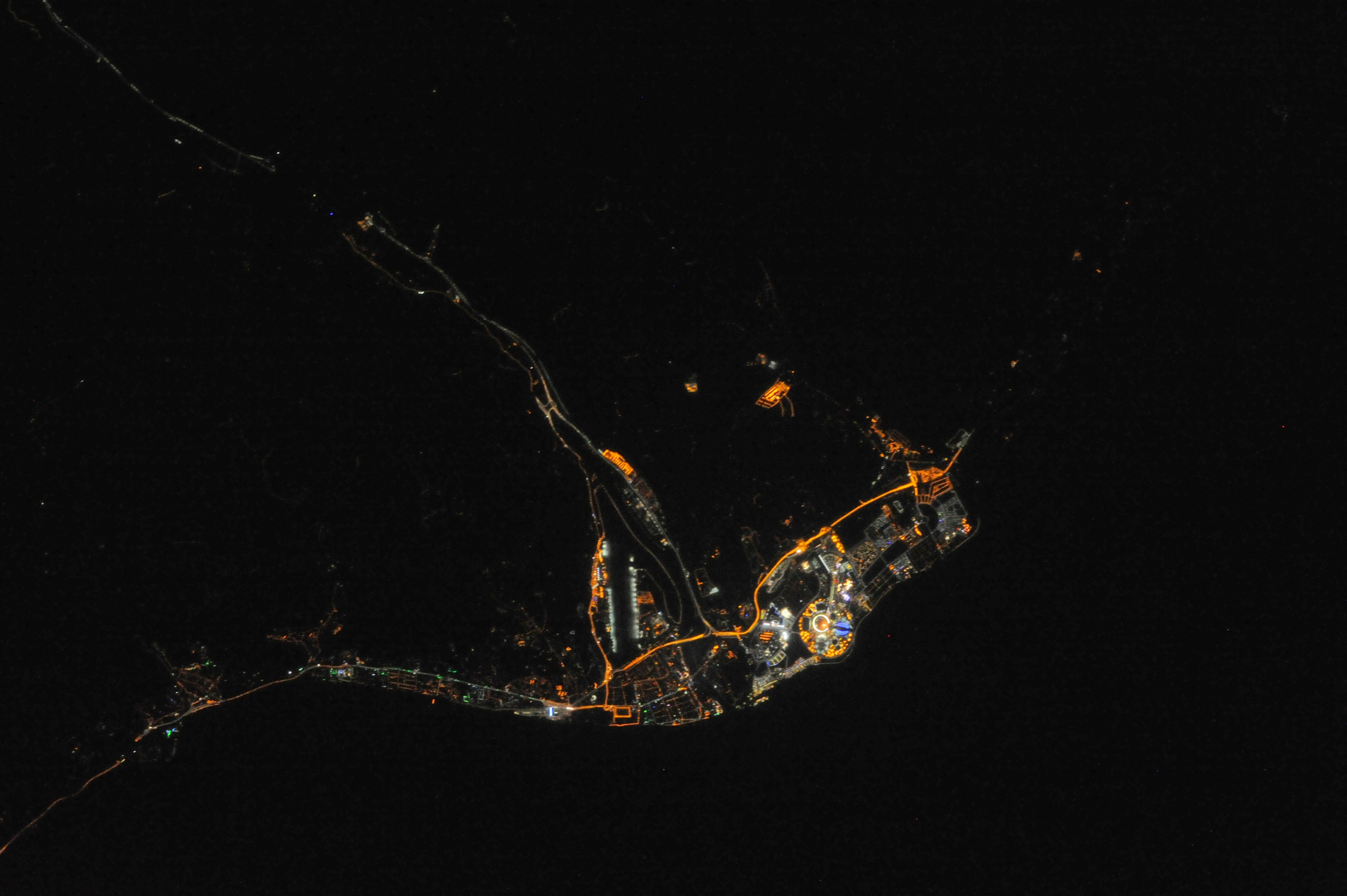 Sochi, Russia, at night seen from the International Space Station. This image was taken by an Expedition 38 astronaut circling Earth around 400 km high during the 2014 Winter Olympic games.