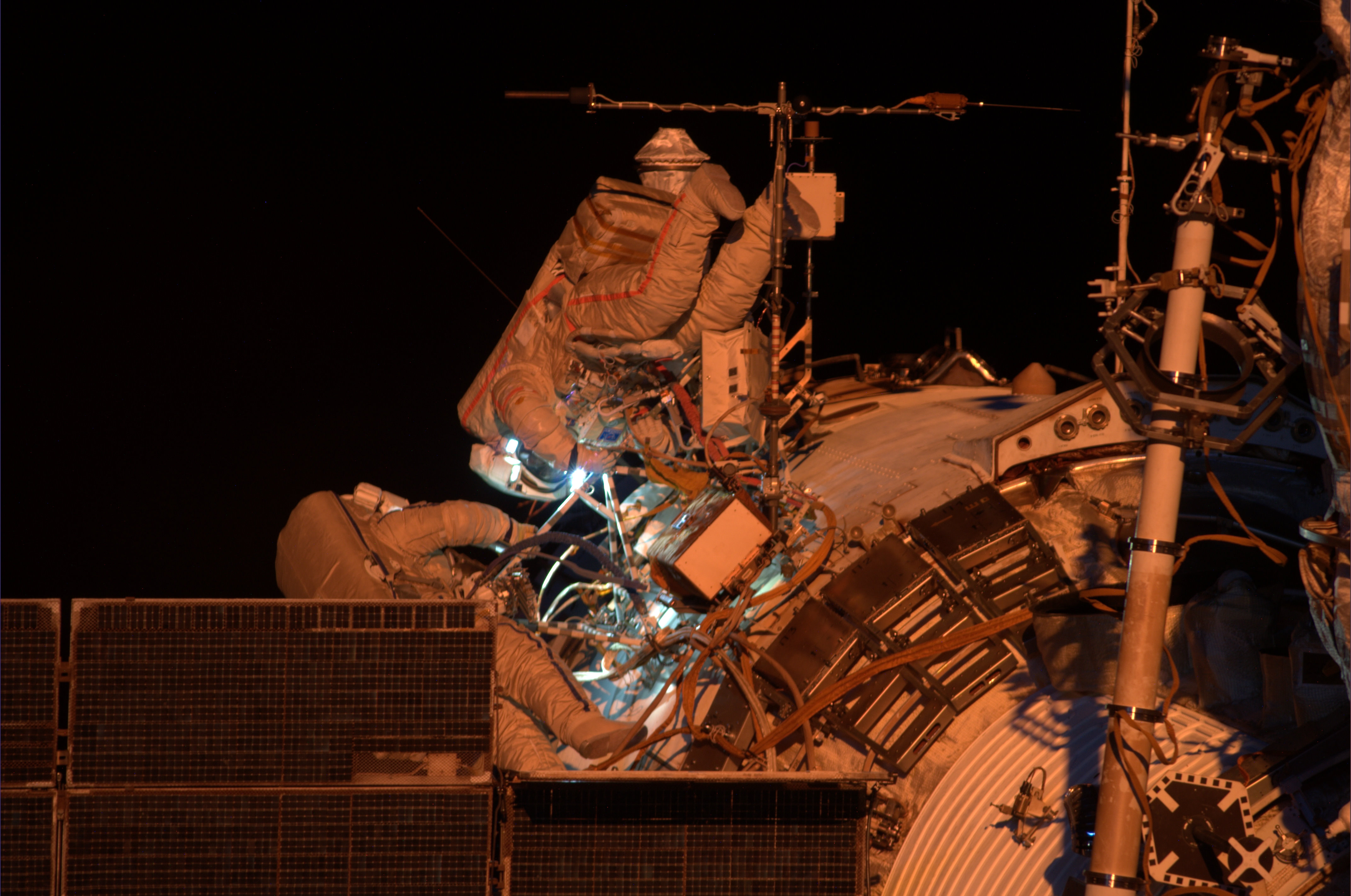 Russian cosmonauts Alexander Skvortzov and Oleg Artemyev spent over six hours working outside the International Space Station on 19 June 2014. This picture was taken by ESA astronaut Alexander Gerst from inside the orbital outpost.