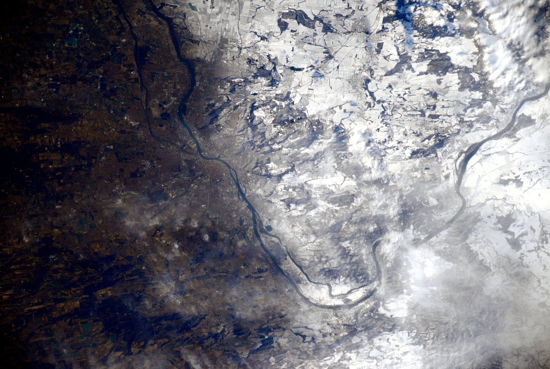 This image of the area around Hungarian capital Budapest was taken from space by ESA astronaut Samantha Cristoforetti as winter approached at the end of December.