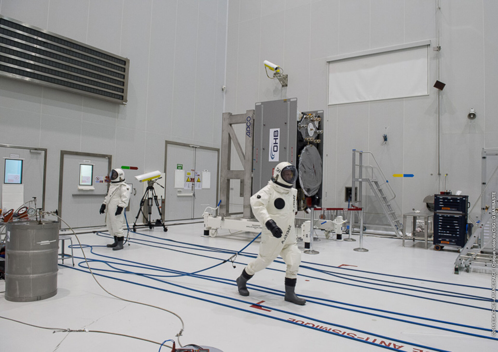 Fuelling of Europe's latest pair of Galileo satellites commenced this week. The eighth Galileo satellite is seen here receiving its propellant load in the S5A fuelling and integration hall of Europe's Spaceport in French Guiana. After its 'sister' (the seventh satellite) co-passenger undergoes this same process, the two will be integrated side-by-side on a dispenser for their shared ride aboard Soyuz on March 27.