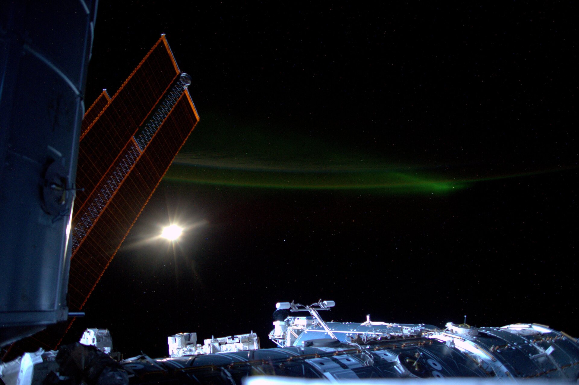 An image of aurora taken from on board the International Space Station and posted by ESA astronaut Samantha Cristoforetti on social media, with the comment: "An aurora in the distance and the Space Station bathed in moonlight."