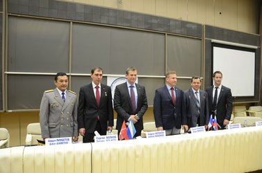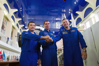 From left: Kazakh cosmonaut Aidyn Aimbetov, Soyuz spacecraft commander Sergei Volkov and ESA astronaut Andreas Mogensen during their final Soyuz spacecraft exams at the Yuri Gagarin Cosmonaut Training Centre in Moscow, Russia, on 7 August 2015.