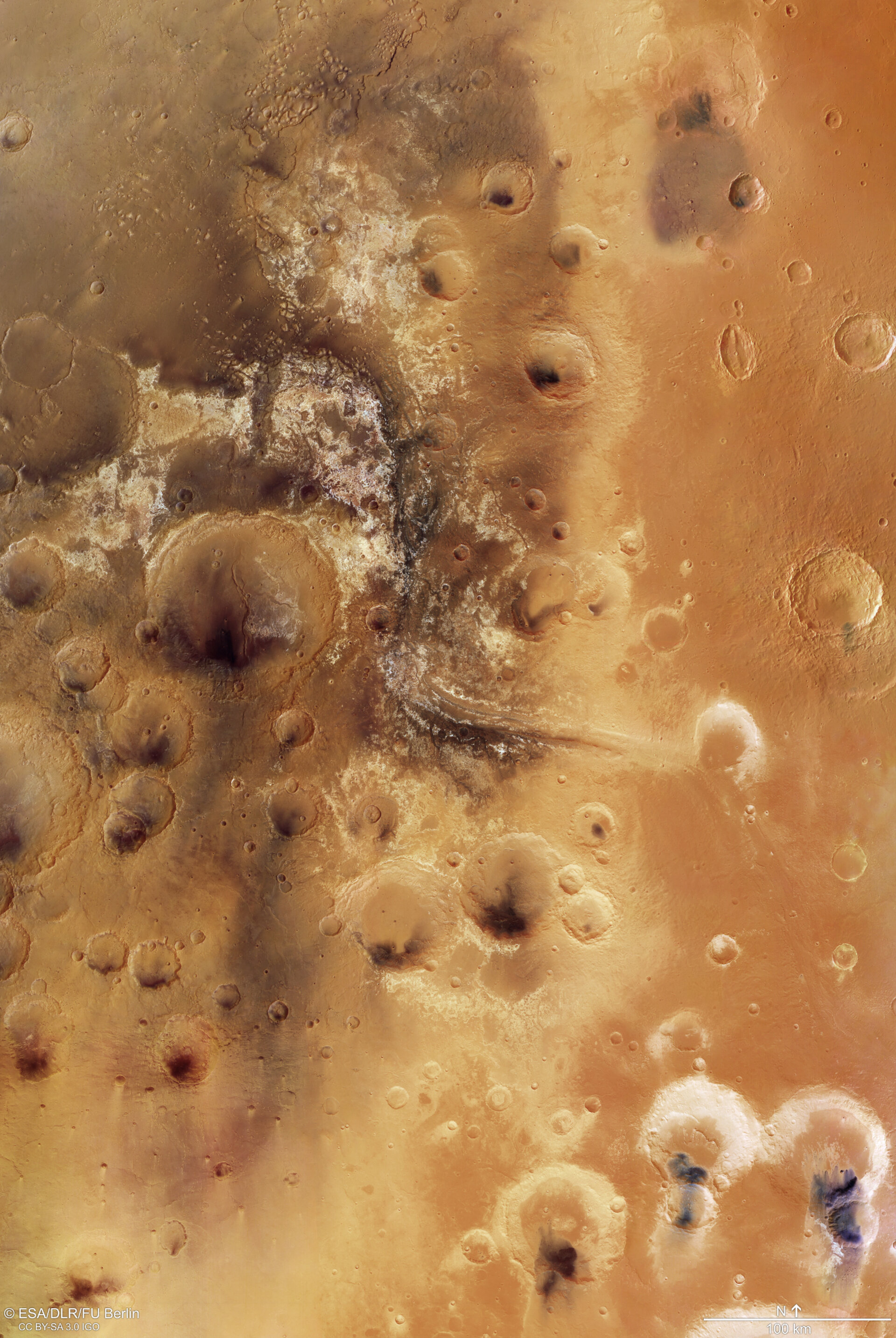 The name comes from the Welsh word for Mars (“Mawrth”) and the Latin for valley (“Vallis”). This mosaic was created using nine individual images taken by the high-resolution stereo camera on ESA’s Mars Express spacecraft, which has been orbiting Mars since late 2003. It is one of a set of images of this region previously published on 7 July 2016 on the DLR website and the homepage of the Freie Universität Berlin.