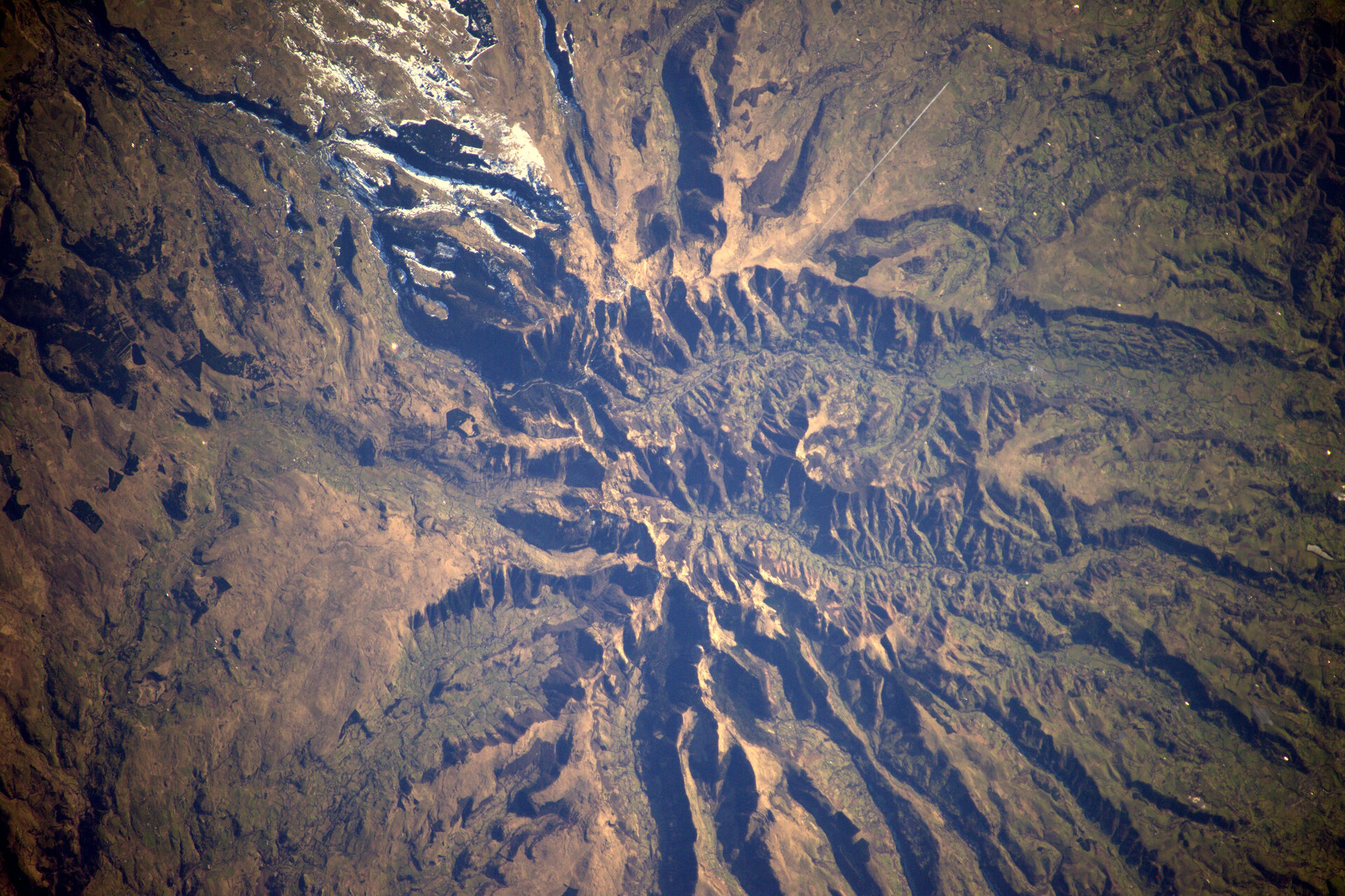Les monts d’Auvergne, tranquillement survolés par un avion, qu’on devine en haut à droite grâce à sa traînée de condensation… le tout survolé par la Station spatiale. Oui, le pilote en moi est ravi d’avoir photographié un avion!