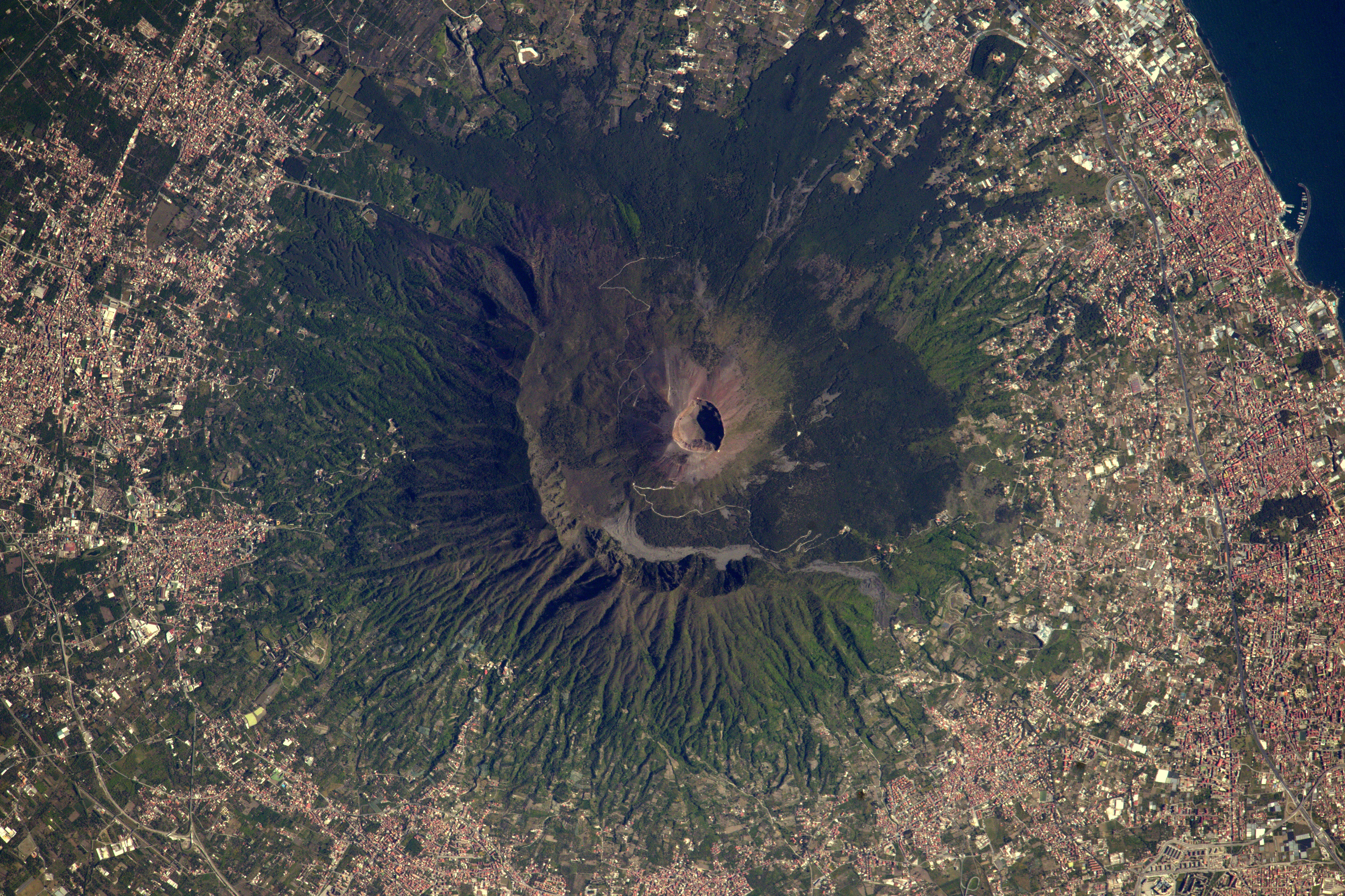 A vertical view of the dormant Vesuvius volcano in Italy. Taken by ESA astronaut Thomas Pesquet from on board the International Space Station.