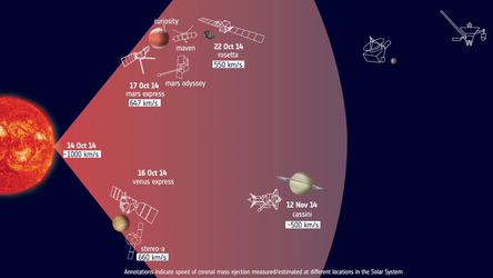 Three Sun-watching satellites in Earth’s vicinity – ESA’s Proba-2, the ESA/NASA SOHO satellite and NASA’s SDO – captured images of the event, while the other spacecraft indicated were in the firing line and made in situ observations of, for example, an enhancement of the magnetic field strength, increases in the solar wind speed, and decreases in the influx of the galactic cosmic rays. NASA’s Stereo-A also captured images from its viewing position, while other data were recorded by ESA’s Venus Express, Mars Express and Rosetta, NASA’s Mars Odyssey and Maven orbiters and its Curiosity rover, and the NASA/ESA/ASI Cassini spacecraft. Although inconclusive, hints of the CME were also seen at NASA’s New Horizons and Voyager-2 three months and about 17 months later, respectively.