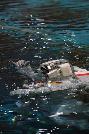 The spacewalk training session includes the donning of the Extravehicular Mobility Unit (EMU) spacesuit on the pool deck and underwater operations. A liquid cooling and ventilation garment complements the EMU spacesuit.