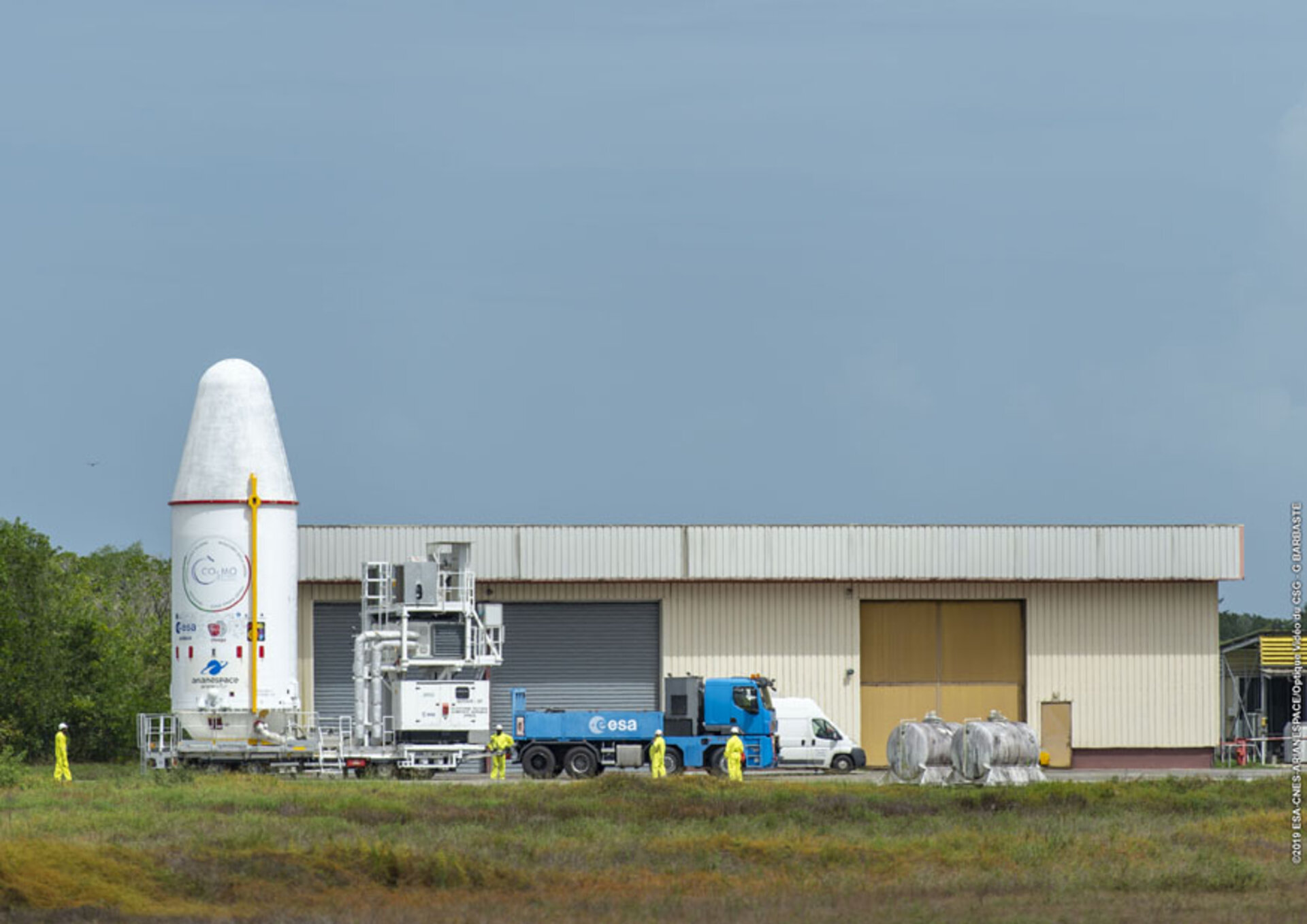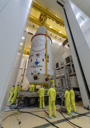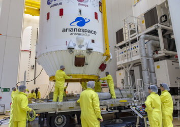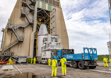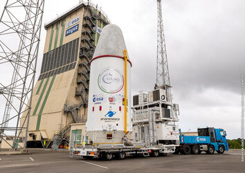 The upper composite of the Soyuz launcher that will lift ESA’s Cheops mission into space is moved from the payload integration facility to the launch pad on a special trailer on 12 December. Launch is scheduled for 17 December from Europe’s Spaceport in Kourou, French Guiana.