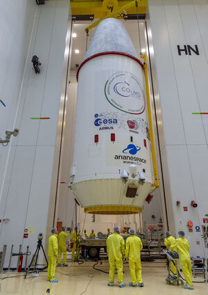 The upper composite, enveloped by the fairing, comprises the Fregat and all passengers – the Italian space agency’s Cosmo-SkyMed Second Generation satellite, Cheops, and three CubeSats: ESA’s OPS-SAT and the French space agency’s CNES's EYE-SAT and ANGELS satellites. The fairing sticker includes, among others, the ESA and Cheops mission logos and the winning design of the Cheops fairing sticker competition, on the left, created by Denis Vrenko.