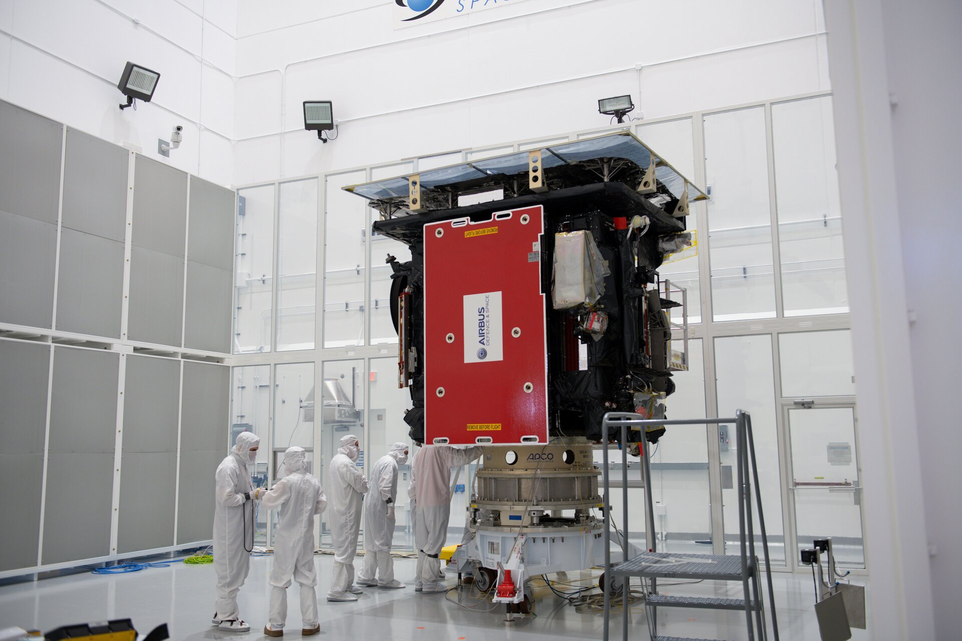 Technicians in the cleanroom at the Astrotech payload processing facility near Kennedy Space Center in Florida preparing ESA’s Solar Orbiter spacecraft for integration with the Atlas V 411 rocket payload adaptor during launch preparations on 16 January 2020.