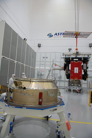ESA’s Solar Orbiter spacecraft being mounted onto the payload adaptor ring (in the front) of the Atlas V 411 rocket at the Astrotech payload processing facility near Kennedy Space Center in Florida during launch preparations on 16 Janaury 2020.