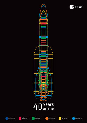 The first Ariane rocket lifted off at the end of 1979. This poster collection celebrates the 40th anniversary of this event, with four different designs featuring the six generations of the Ariane family of launchers.
