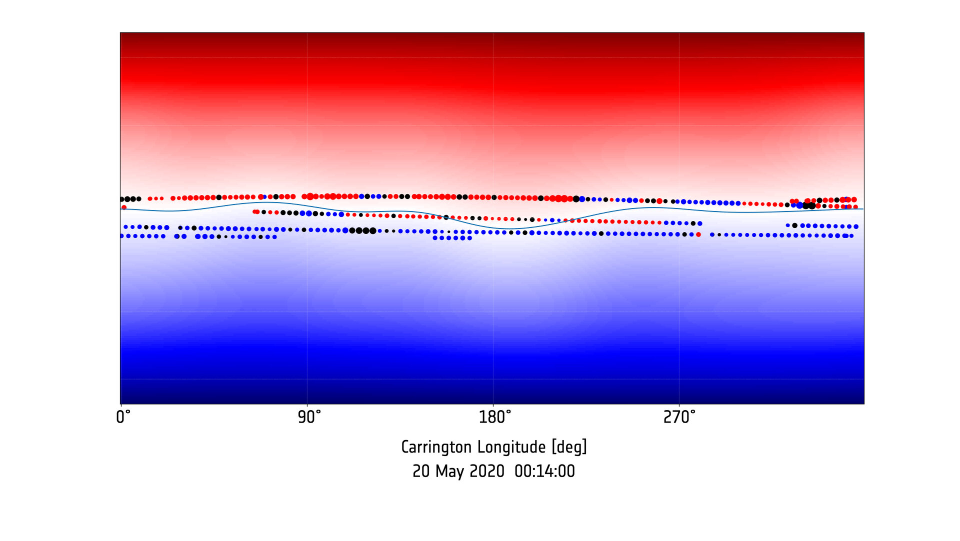 Solar Orbiter’s Magnetometer (MAG) instrument measures the magnetic field in the solar wind as it flows past the spacecraft. The solar wind is a stream of electrically charged particles from the Sun that carries magnetic fields with it. This graph shows a map of the Sun’s magnetic polarity (north and south are shown in red and blue respectively) with measurements from the Solar Orbiter magnetometer overlaid (the coloured dots). The two show excellent agreement with one another, indicating that the solar wind carries the Sun’s magnetic field out into the wider Solar System.