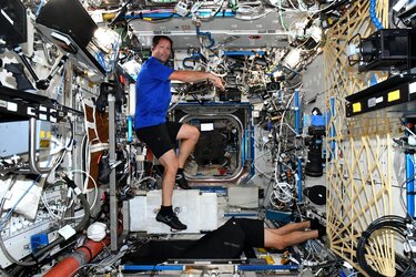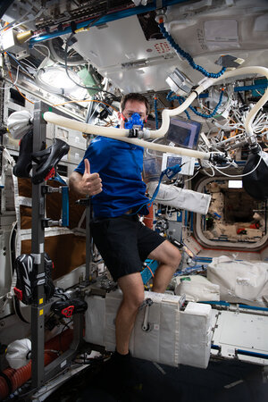 Thomas shared this image on his social media channels with the caption:"Diagnosing (and then fixing!) the ergometer on our exercise bicycle. I like this photo because it shows what kind of environment we work in. It might look a bit chaotic but everything is under control, or strapped down. The instruction manual behind me is turning pages on its own – Harry Potter style – cables are moving, a vacuum cleaner is floating into view – while the camera, laptop and tools are velcroed to the walls or ceiling. I have started wrapping my Bluetooth headphones around my arms when not in use so they don't float away too! I was taking a picture for ground control but happy to report that the maintenance is done, and the exercise bicycle works again!"