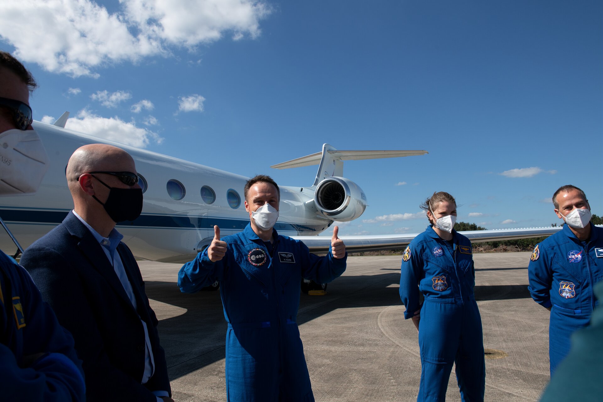 ESA astronaut Matthias Maurer and his NASA crew mates Raja Chari, Thomas Marshburn and Kayla Barron arrive at NASA’s Kennedy Space Center in Florida, USA on 25 October 2021.
