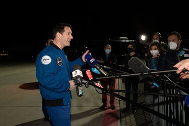 ESA astronaut Thomas Pesquet talks to the press after he arrives in Cologne, Germany, on 9 November 2021 following his return from the International Space Station on SpaceX’s Crew Dragon Endeavour.