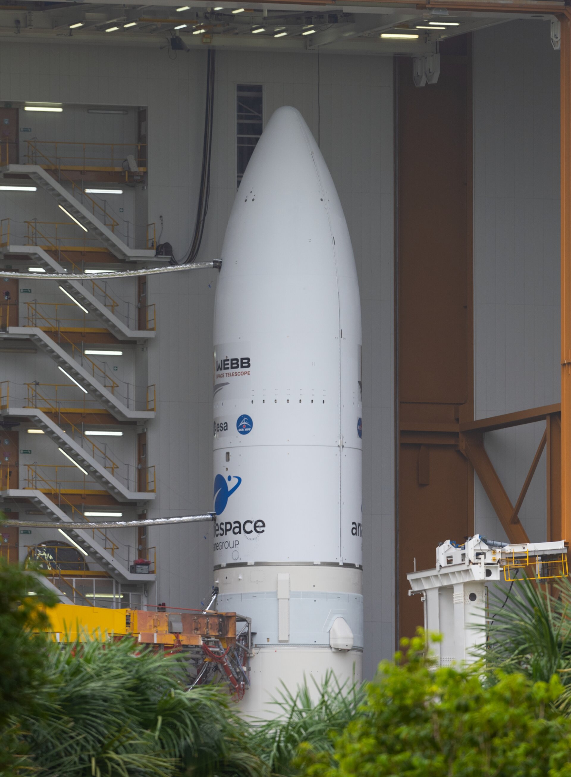 On Thursday 23 December, the James Webb Space Telescope, safely stowed inside the fairing of ESA’s Ariane 5 launch vehicle, left the final assembly building for roll-out to the launch pad at Europe’s Spaceport in French Guiana.