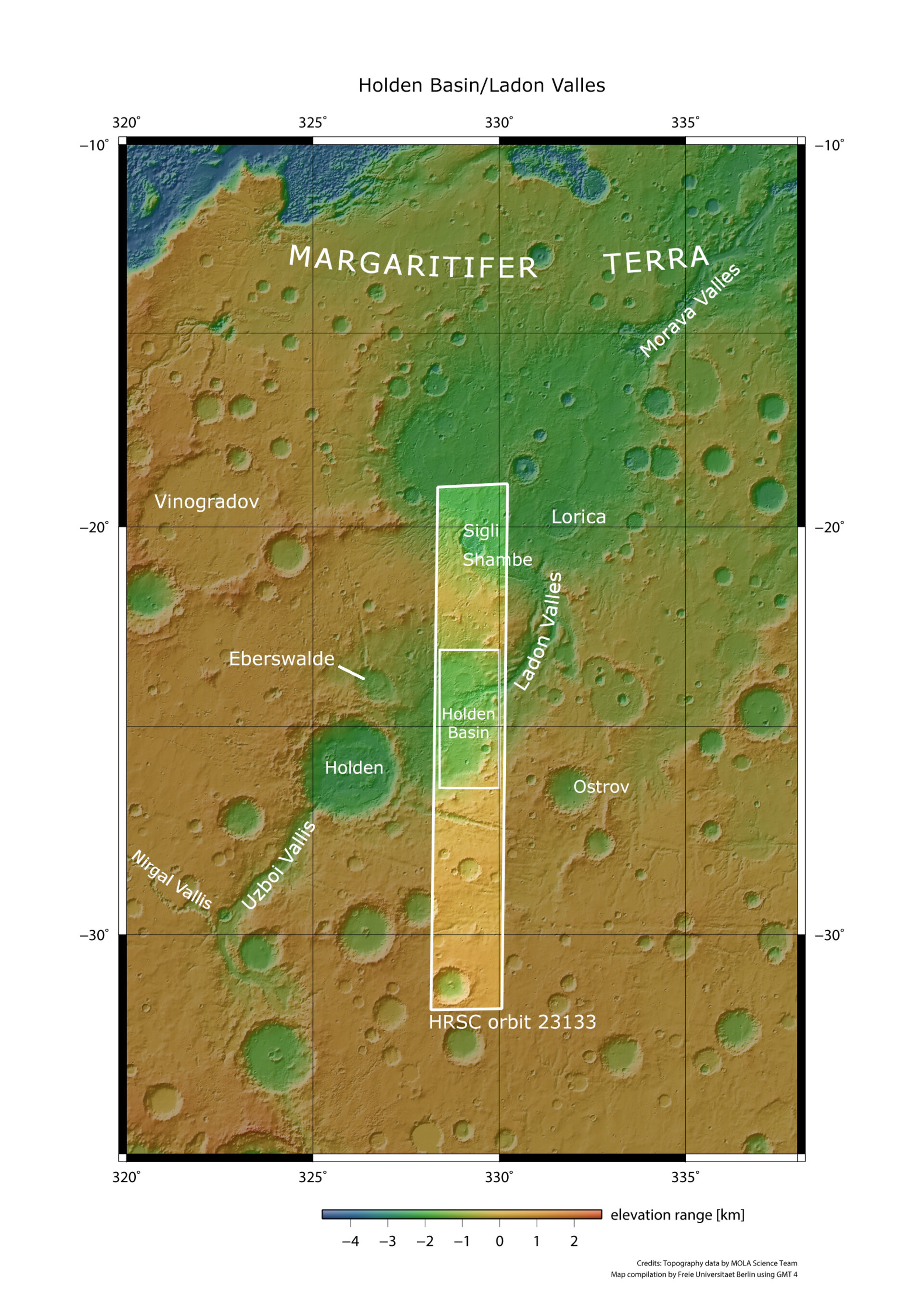 This image from ESA’s Mars Express shows the informally named Holden Basin, which formed part of Mars’ Uzboi-Ladon-Morava (ULM) outflow system.