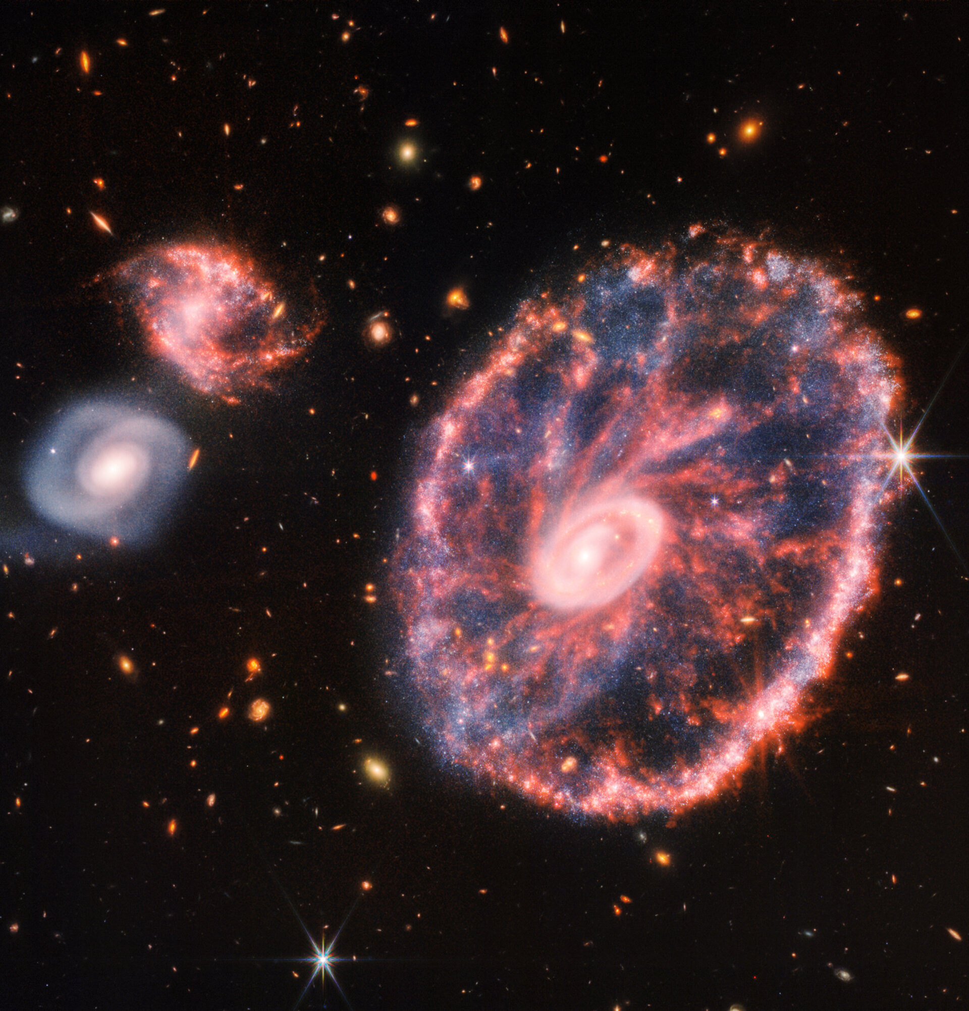 Comparing the Cartwheel Galaxy in near- and mid-infrared wavelengths through the eyes of Webb's NIRCam and MIRI instruments. The left hand image shows the combined NIRCam and MIRI view, the right hand image shows only the MIRI view. Combining the data of the two instruments reveals details that are difficult to see in the individual images alone.