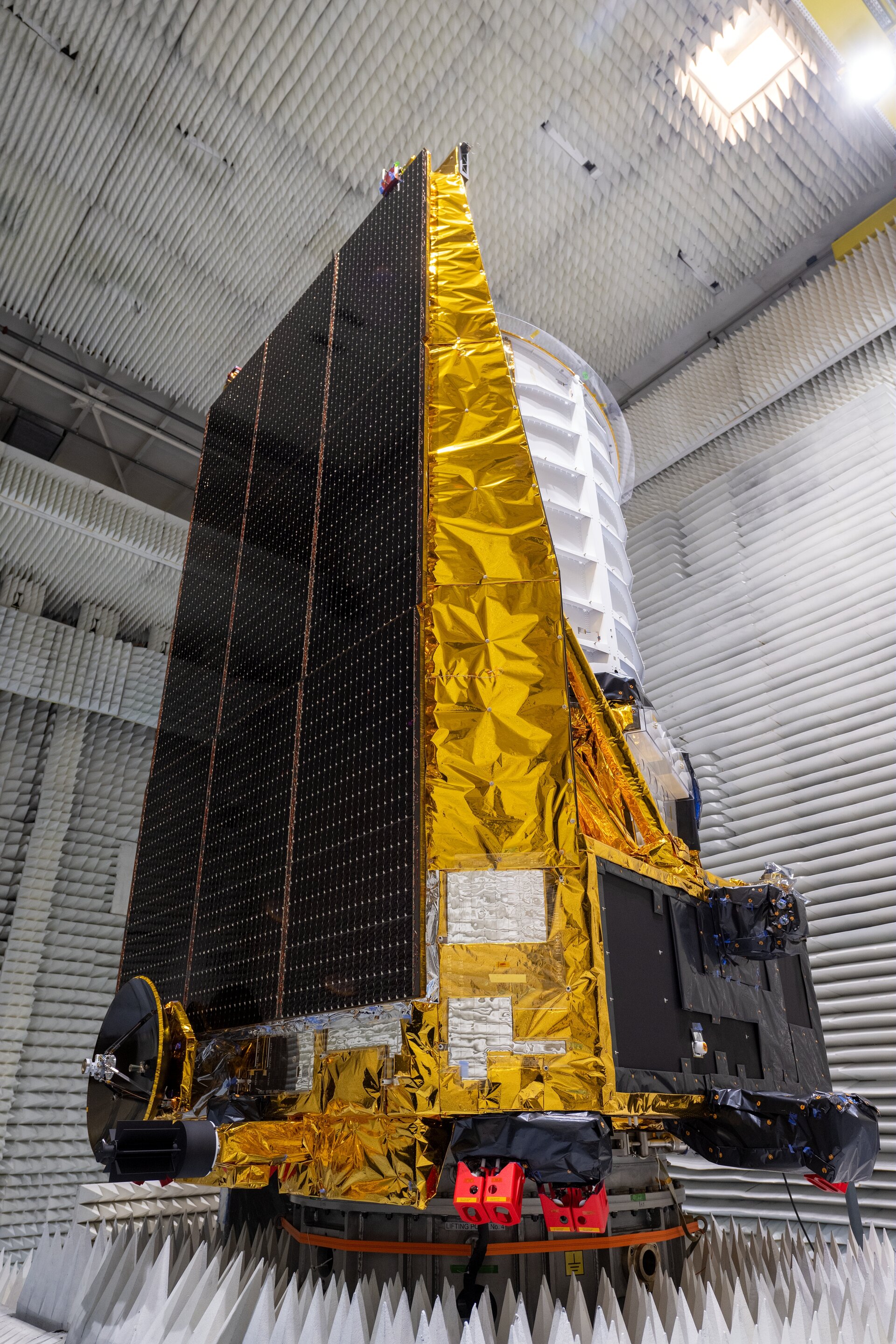 Here it is standing in a special room in the Thales Alenia Space test facilities in Cannes, France, where it successfully underwent electromagnetic compatibility testing.