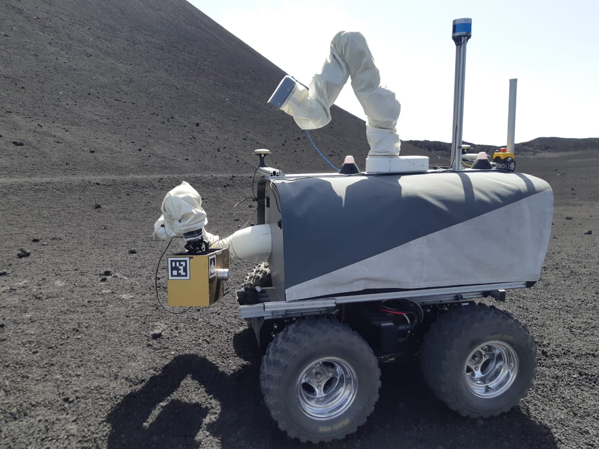 ESA's Interact rover, a 4 wheel drive rover with 2 robotic arms, driving on the surface of Mount Etna in Italy. The Interact rover is a part of the Surface Avatar experiment, where astronauts will operate a group of robots from the International Space Station.