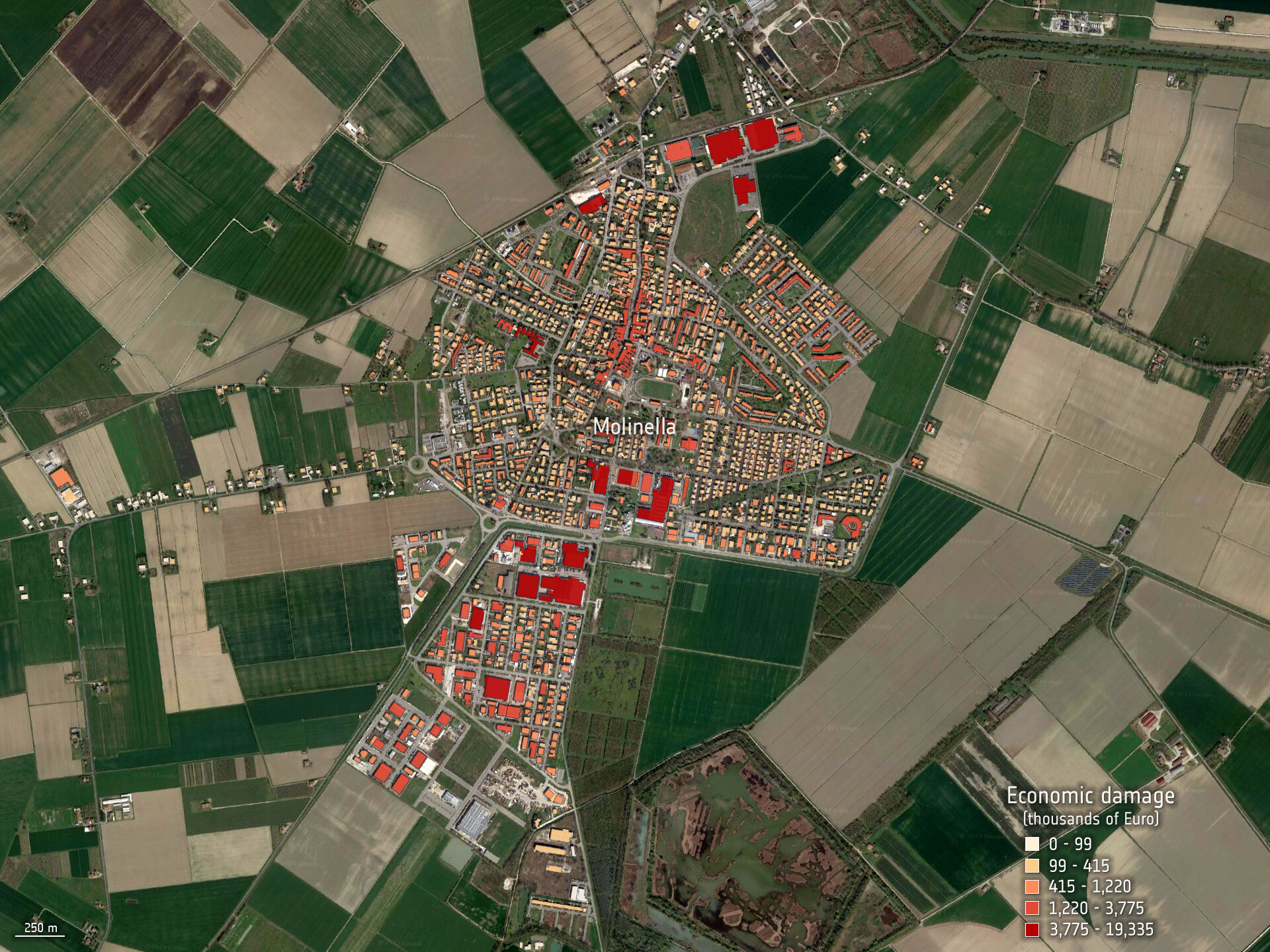 The image on the right shows the estimated economic losses in Euro for residential buildings in the city of Molinella. They were computed exploiting the SaferPlaces damage model using the water depth maps as input.
