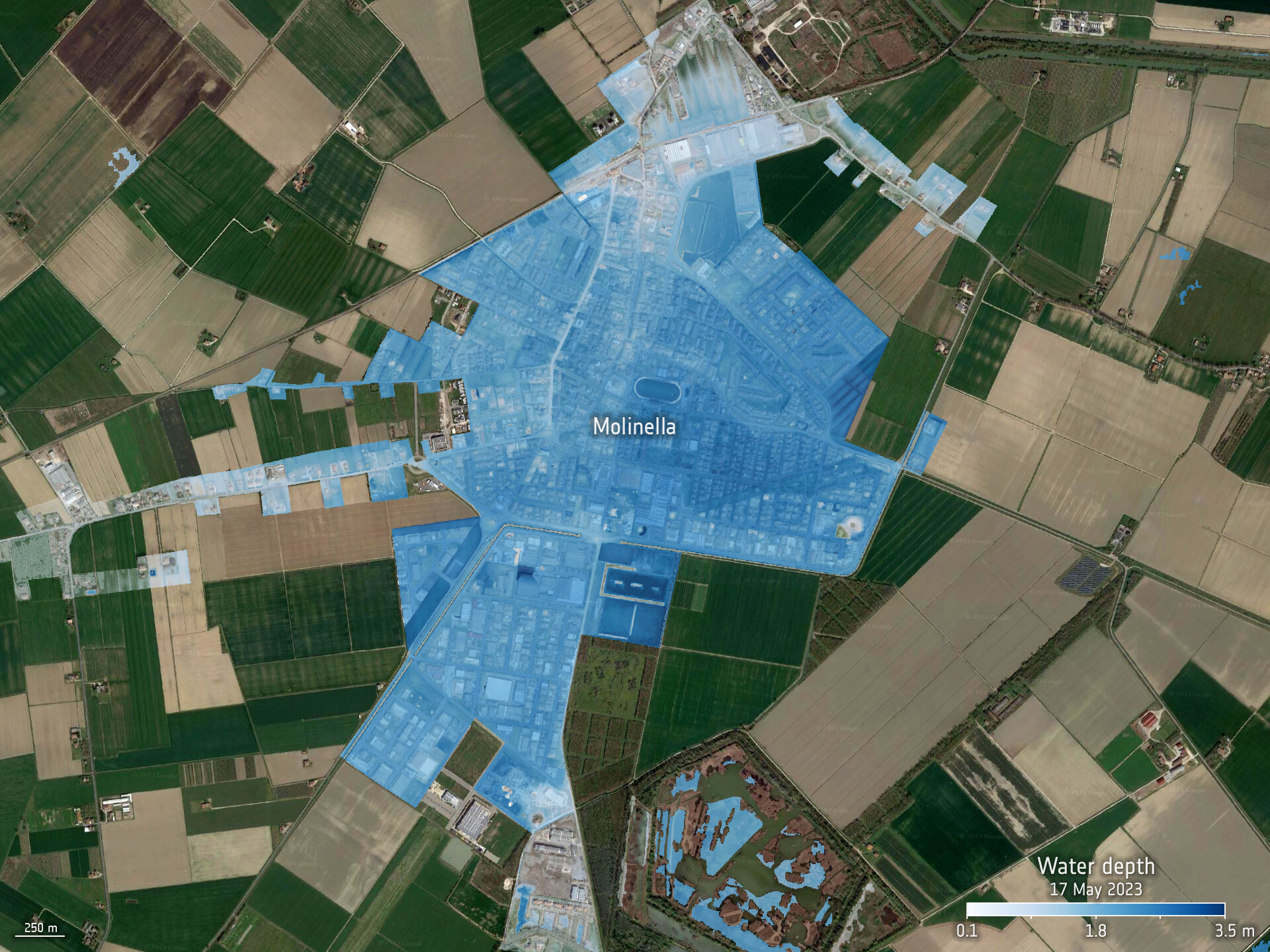 Maps portraying the extent of the flooded areas in some of the most affected municipalities, including Molinella, were generated with information on the depth and volume of the water. The image on the left shows the water depth (m) over Molinella from 17 May 2023, extrapolated by processing satellite data and Digital Elevation Models (DEM) with the SaferPlaces platform.