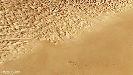 Image description: This tan-coloured patch of Mars's surface is split visually in two on the diagonal from lower left to upper right: the upper half is smooth and features a single impact crater (Yelwa Crater), while the bottom half is wrinkled, ridged, textured and at higher relief. This textured ground is Lycus Sulci, on the aureole of Olympus Mons.