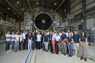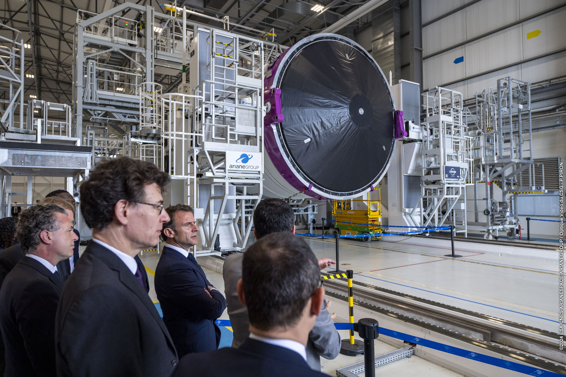 French President Emmanuel Macron visited Europe's Spaceport on 26 March 2024 to see preparations for the new European rocket Ariane 6. The President addressed the teams working on Ariane 6 in the launcher assembly building, with the rocket's upper stage and core stage that will soar into space soon in the background. Also present was Toni Tolker-Nielsen, ESA’s Director of Space Transportation, Philippe Baptiste CEO of France’s space agency CNES, Martin Sion CEO of ArianeGroup, Stéphane Israël CEO of Arianespace and François Ringuet, the mayor of Kourou, French Guiana.