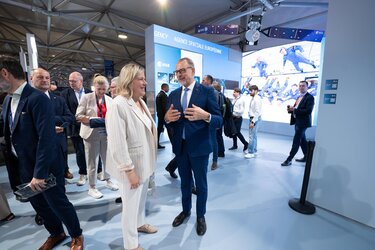 ESA Director General Josef Aschbacher receiving a gift on stage at the Slovenian celebration of ESA membership.